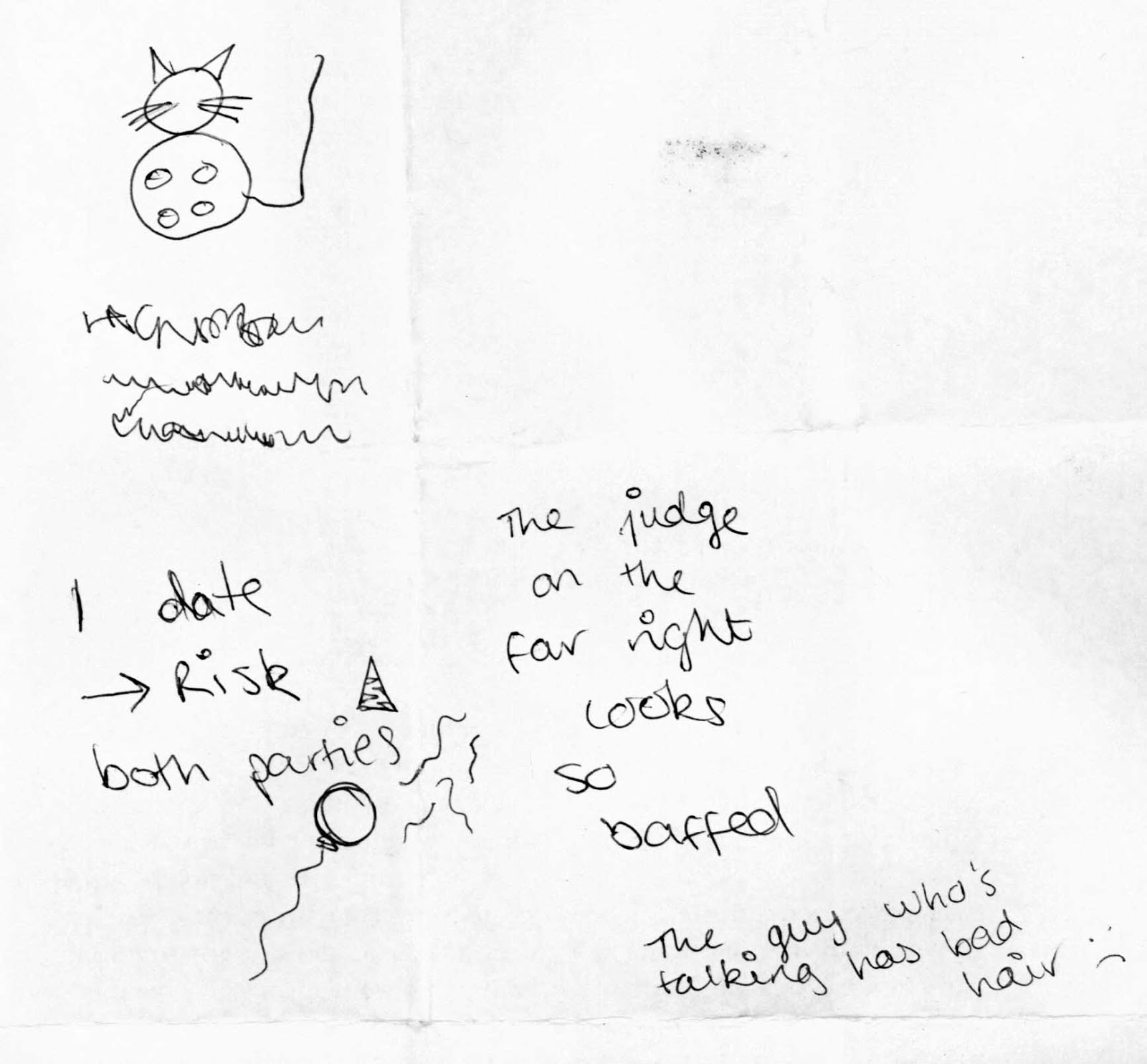 I find a discarded note downstairs in the café. A girls’ school party has been observing today’s appeal, which is not about cats. I learn from the internet that baffed [sic] is a word, distinguishable from baffled. Girls, judge not, that ye be not judged (Matthew 7:1), or at least don’t leave the evidence lying around.